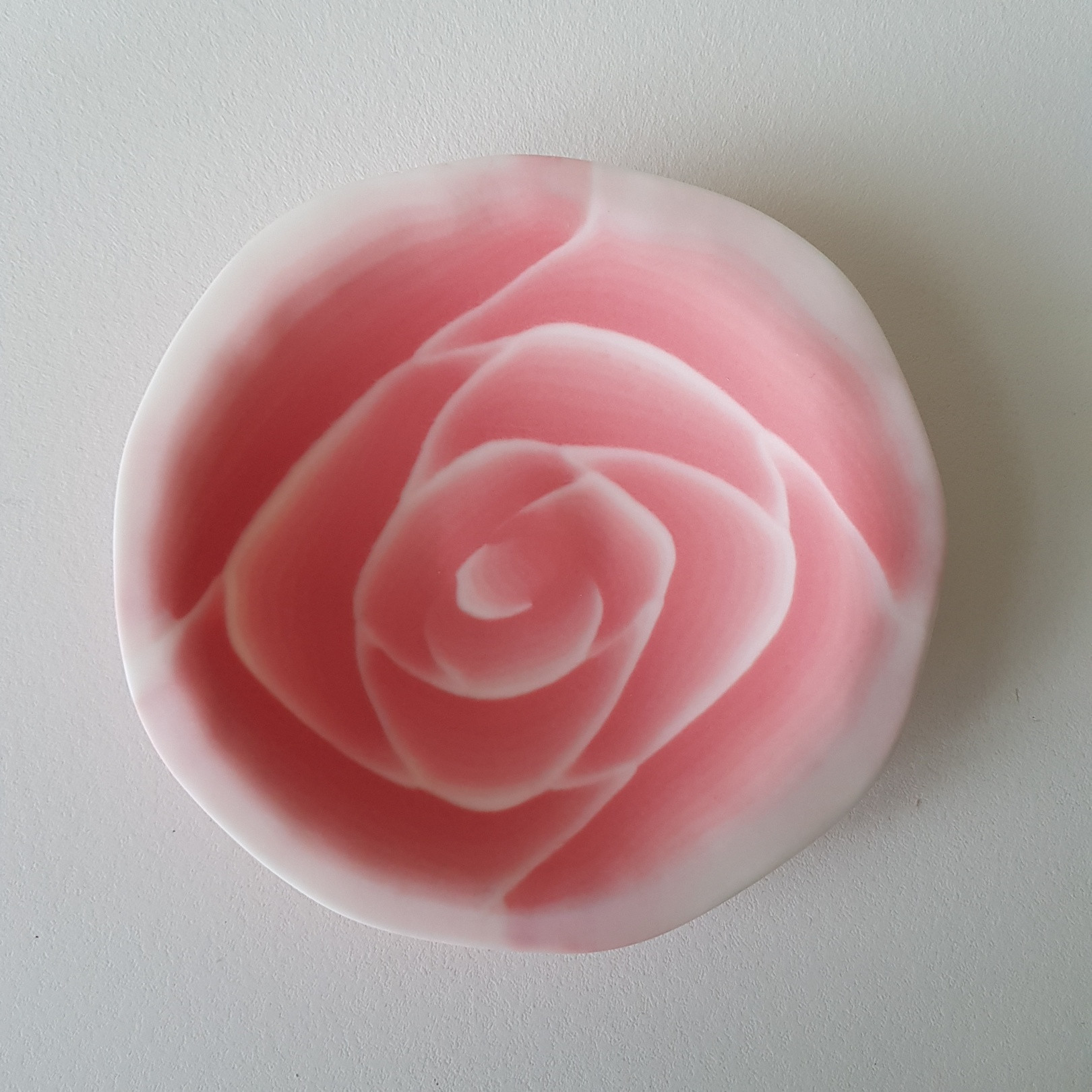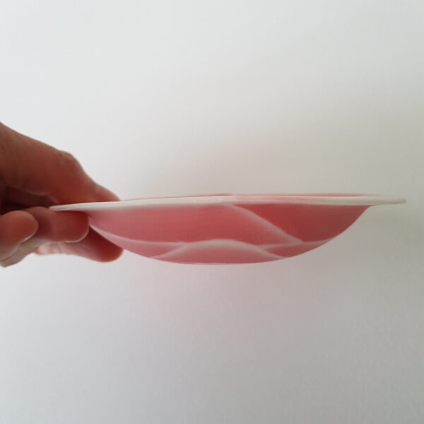 Les motifs, le dégradé des couleurs et les lignes que vous voyez sur cette pièce sont le résultat d’assemblage de petits morceaux de porcelaine teintées préalablement par Yuko, elle-même. Comme les couleurs traversent dans la matière, vous voyez la même image dans le recto et le verso.