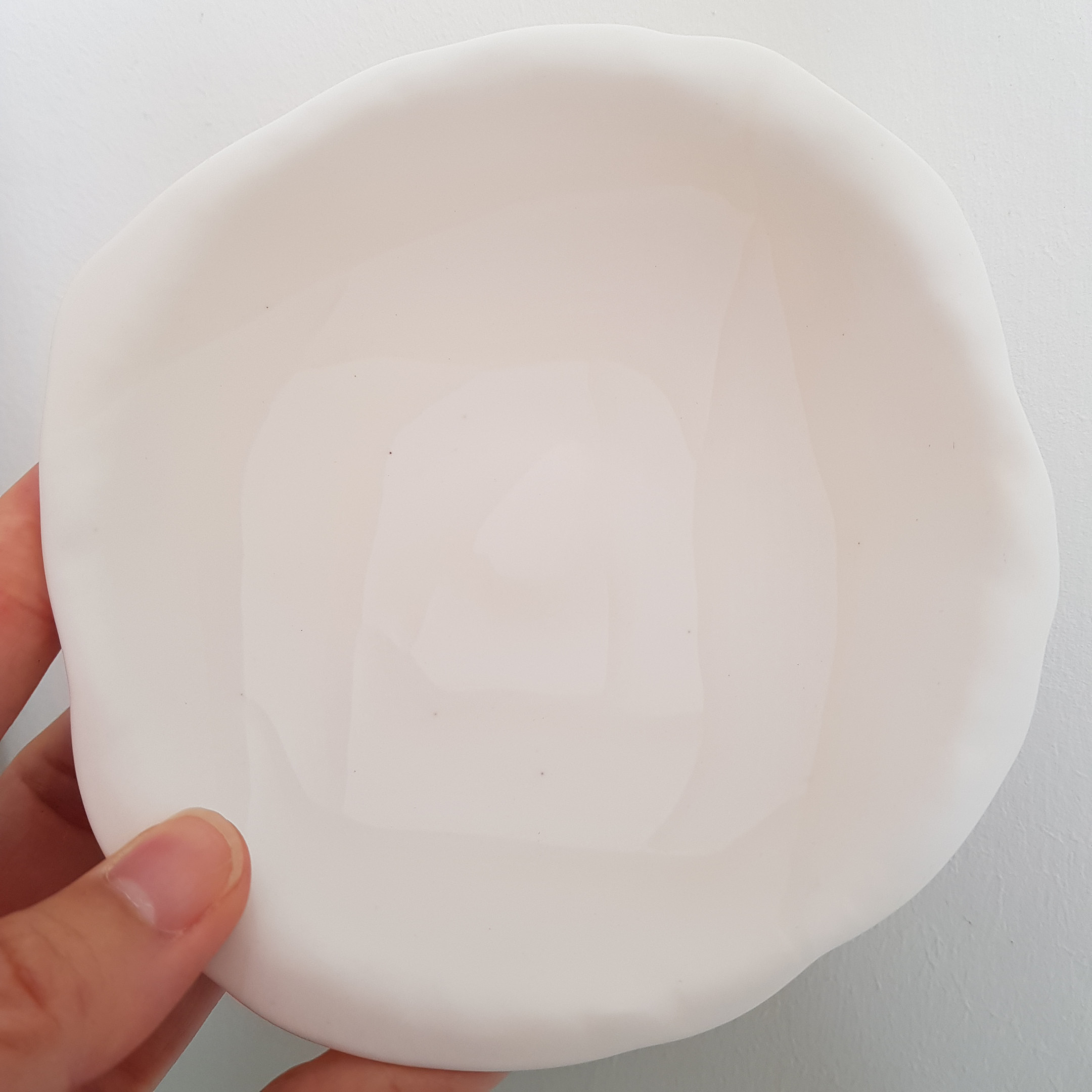 Les motifs, le dégradé des couleurs et les lignes que vous voyez sur cette pièce sont le résultat d’assemblage de petits morceaux de porcelaine teintées préalablement par Yuko, elle-même. Comme les couleurs traversent dans la matière, vous voyez la même image dans le recto et le verso.
