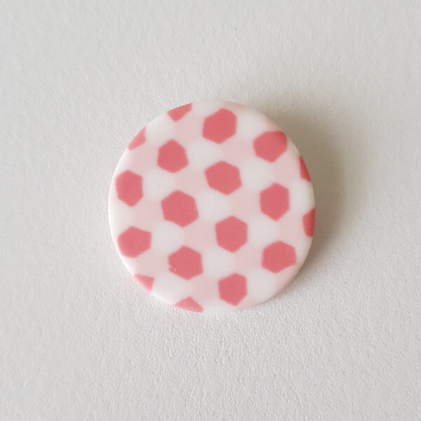 Broche en motif écaille de tortue, dans le ton rose, faite avec la technique “nerikomi”, autrement dit nériage, terres-mêlées. Les couleurs sont dans la masse, ce n’est ni peint ni imprimé. Les dégradé de couleurs ou les lignes, tout ce que vous voyez sur cette pièce sont le résultat de assemblage de petits morceaux de porcelaine teintées préalablement par Yuko, elle-même.