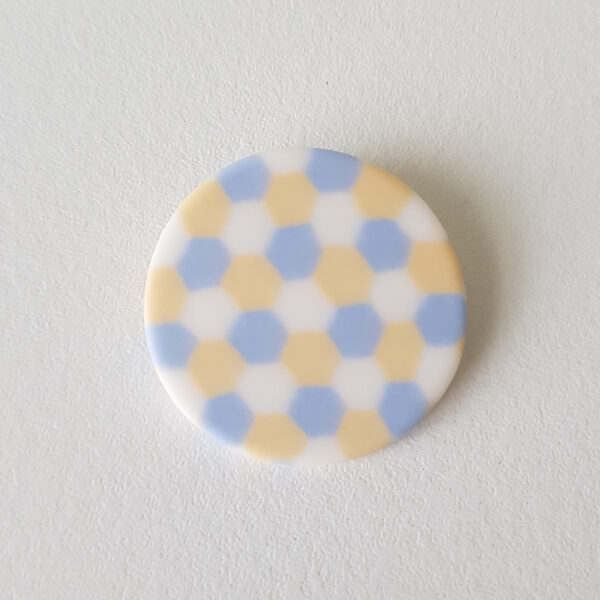 Broche en porcelaine, en motif écaille de tortue, bleu et jaune, faite avec la technique “nerikomi”, autrement dit nériage, terres-mêlées. Les couleurs sont dans la masse, ce n’est ni peint ni imprimé. Les dégradé de couleurs ou les lignes, tout ce que vous voyez sur cette pièce sont le résultat de assemblage de petits morceaux de porcelaine teintées préalablement par Yuko, elle-même.